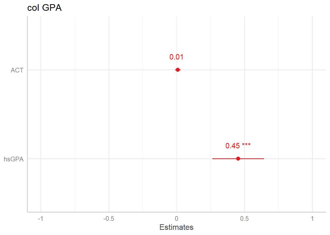 \[\widehat{colGPA} = 1.29 +0.01 \dot\ ACT + 0.453\dot\ hsGPA \]